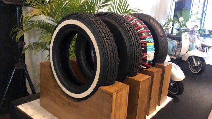 Millennium Tires merilis ban motor untuk vespa klasik dengan harga mulai Rp 200 ribuan, ban tersebut adalah V-Max 3.50-10 White Ribbon Series.