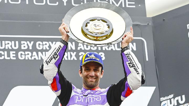 Pembalap tim Pramac Racing, Johann Zarco terlihat sempat mengamuk di podium MotoGP Australia 2023, Sabtu, 21 Oktober 2023.